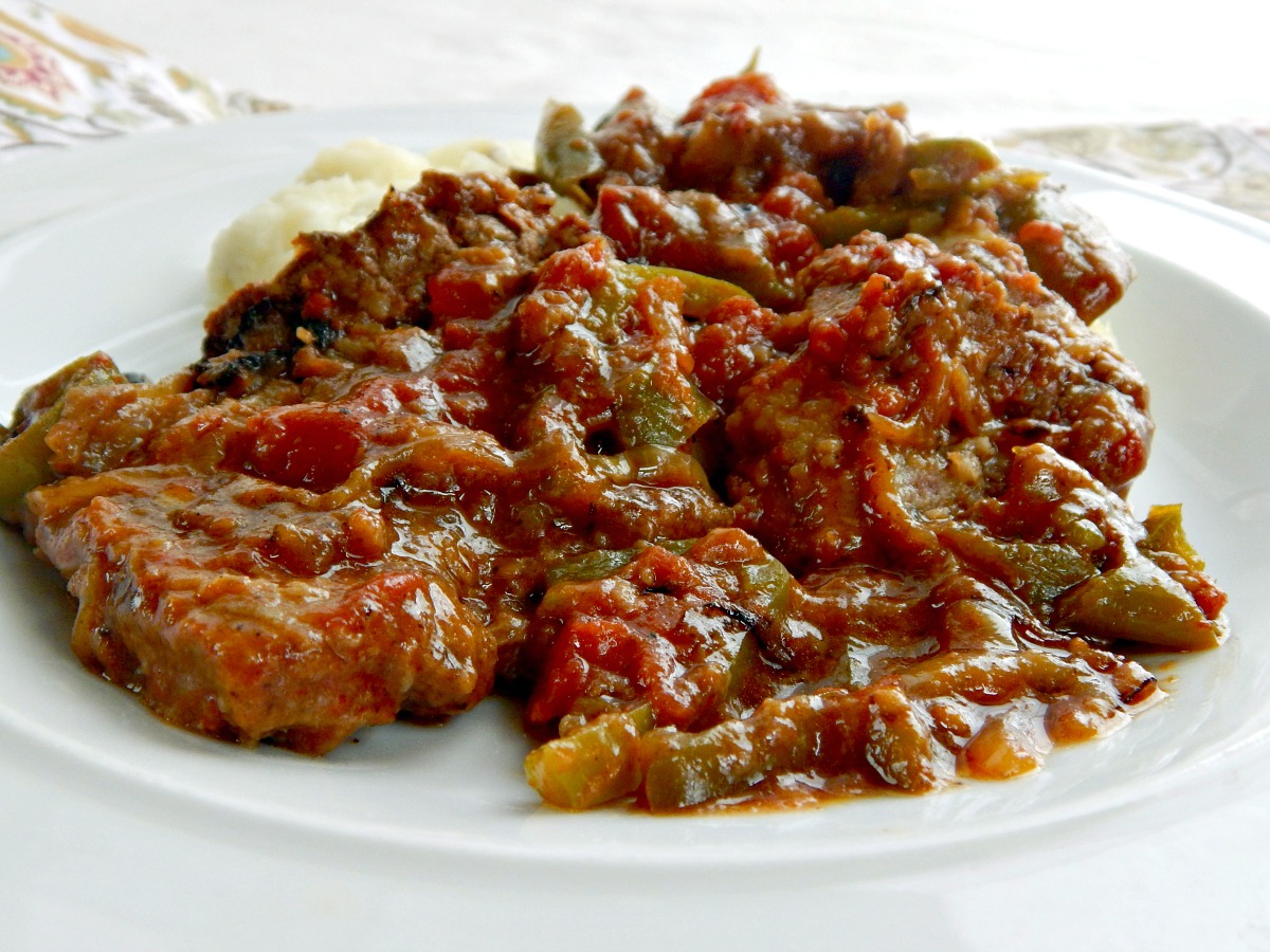 The Swiss Steak, alone, when I made this recipe ran about $5.35, buying all ingredients on sale. Canned tomatoes are always in my pantry and any pantry ingredients I stock up on whenever they’re on sale. I want to always have enough in my pantry so I never really run out and end up paying full price for an ingredient. Peppers go on sale regularly, and it makes sense to buy enough for the current week and for the next. They’ll keep well for a week or two, and can be pricey enough that it makes sense to plan to use them when the cost is low.