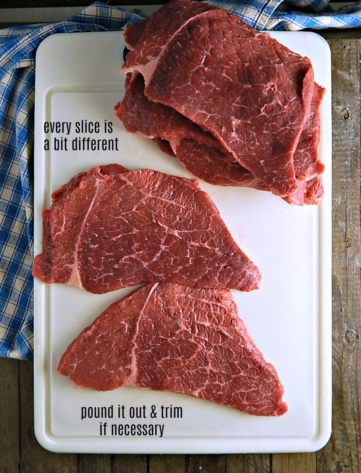 I gotta give a shout out to my small, cheap Kitchen Slicer. It’s indispensable for this as well as Chicken Fried Steak, French Onion Soup, Guinness & Onion Soup, French Dips, or Panera Steak Paninis from my 30 Minute Instant Pot Roast, and my Iowa Pork Tenderloin, along with the Swiss Steaks, above. And that’s not mentioning how easy it is to slice homemade bread or turn my leftover ham & turkey into lunch meat or slice large batches of just about anything for a party, like cheese, smoked sausages, or tomatoes. Think about getting one if these kinds of things are in your wheelhouse.