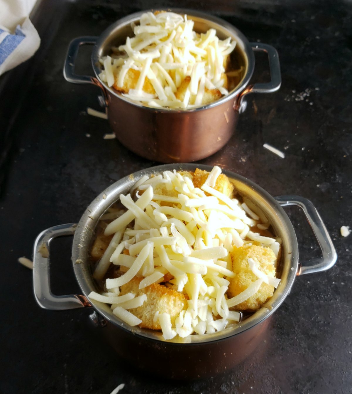 - I also add a little layer of cheese on top of the soup itself, before adding the croutons. It keeps the croutons from becoming prematurely soggy as you layer them on and broil the soup.