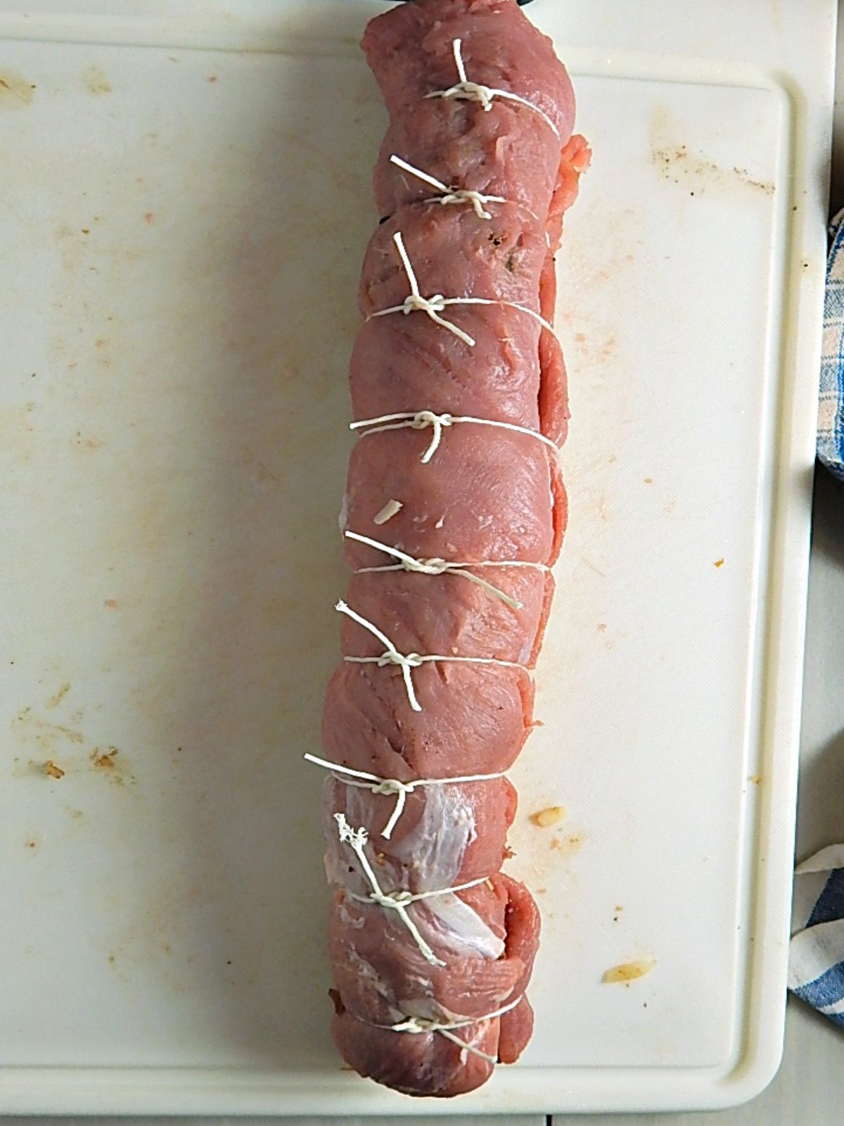 I lay the strings for tying out on my cutting board and then put the tenderloin on top of it, then spread out the stuffing, leaving one long side clear. That makes it easier to roll and stuffing won’t squirt out (or at least not too much) when you get to the end. If you lose any stuffing, just shove it back in.