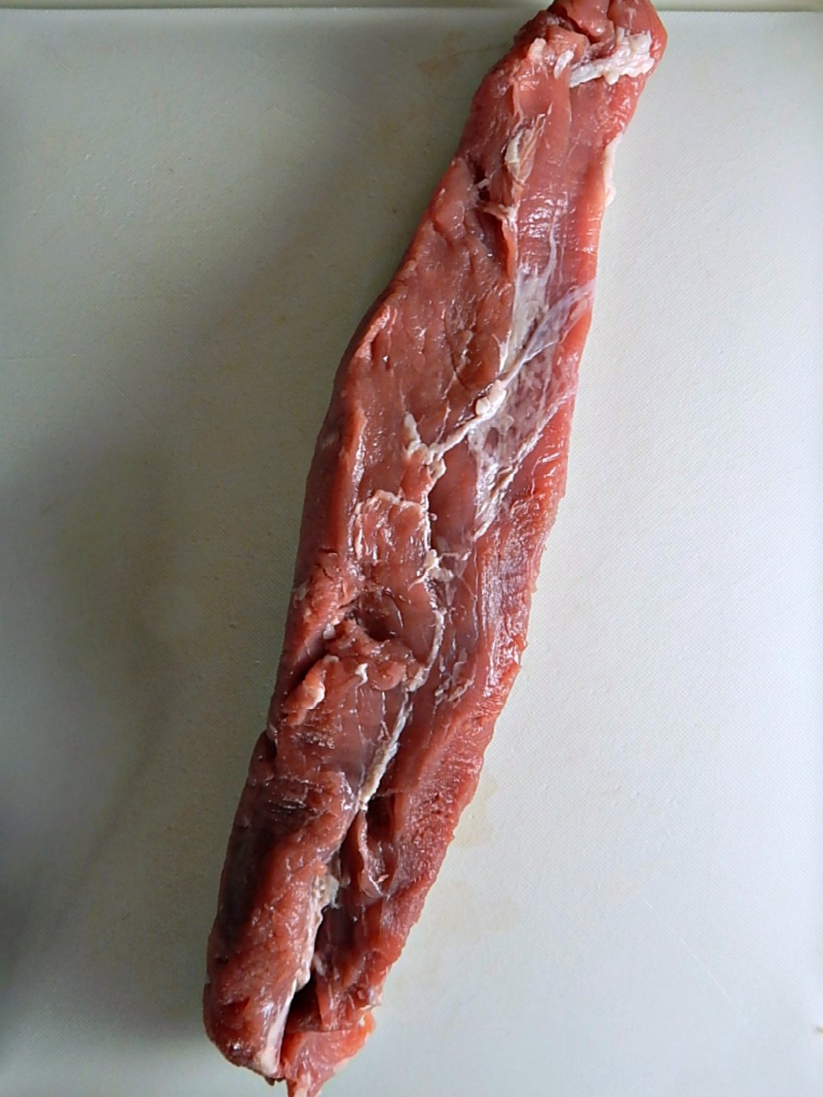 The last pork tenderloin I got (first time buying one at Costco) I thought was huge but I opened the package to find two scrappy looking little things. I was dismayed! How could I stuff that? It’s in the pics, below. I couldn’t really spiral cut it but I cut partway into it and then just angled my knife, taking small slices until I had one side relatively flat, then turned to the other side and did the same…it all worked out and it’s the same principle.