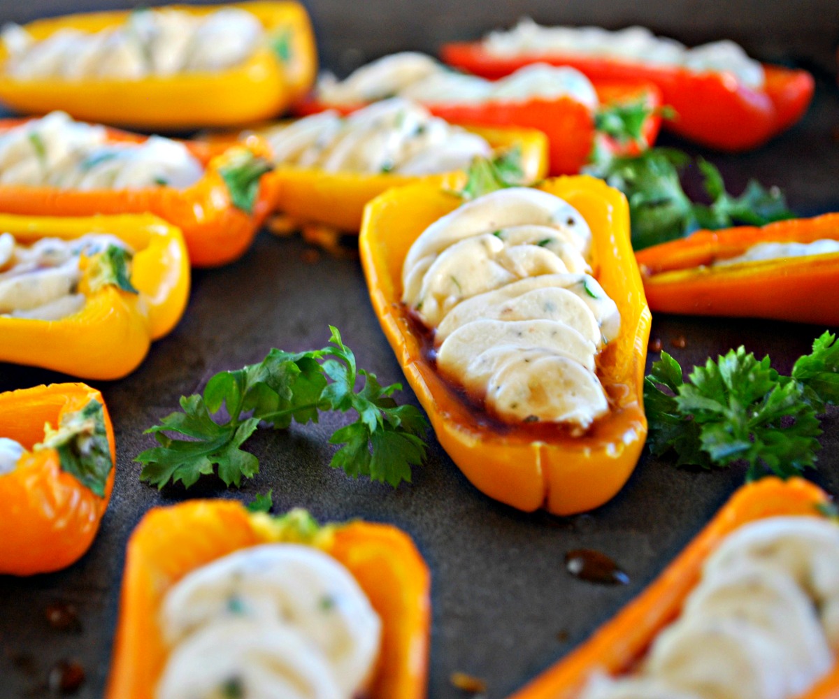 If you’re looking for a fun & festive little appetizer, mini peppers might be just the thing. These mini peppers are slightly roasted and stuffed with a sophisticated mixture of goat cheese & herbs and then drizzled with a little balsamic honey right before serving.