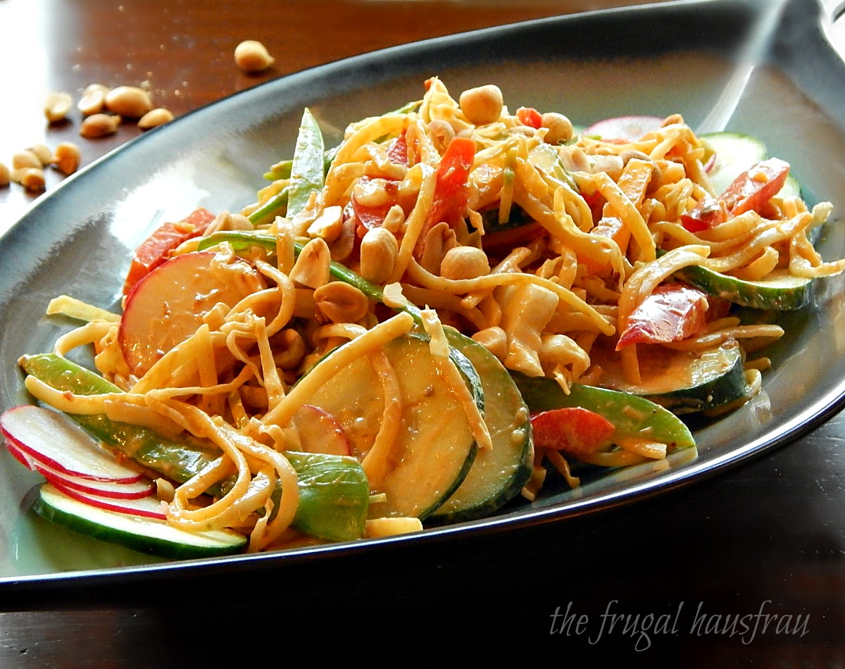 Watch for great sales prices on the vegetables for this salad, and make it seasonally, using what’s at hand, and it will come in at a budget price. As far as the noodles and peanut butter, they’re pretty much staples that last for a good amount of time. Cut your coupons and wait for a good sale and stock up at a low. Freeze any products containing flour for three days when they come into your home and you’ll have no worries.