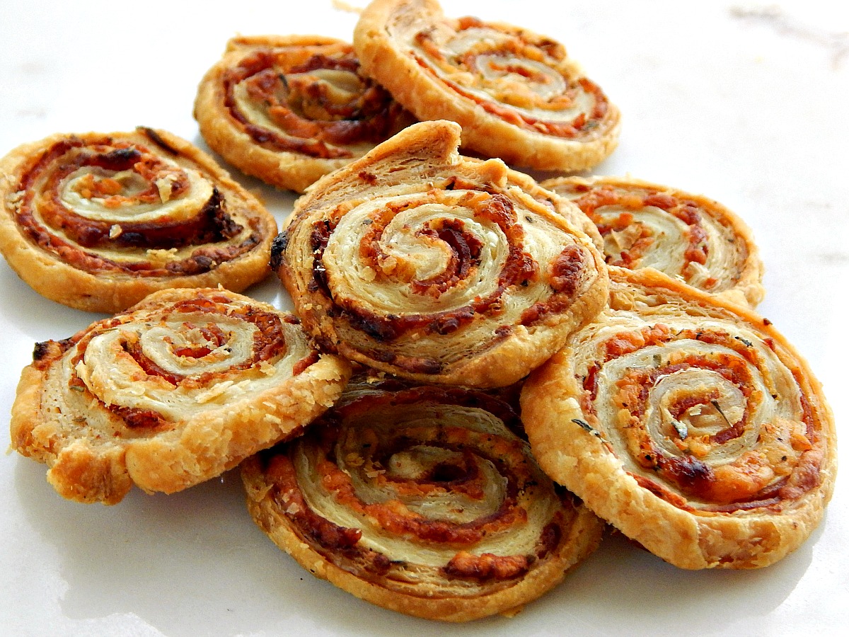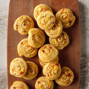 Baked pinwheels follow a formula. Some type of pastry is laid out in a rectangular shape, either pie crust or pizza dough or puff pastry or possibly crescent rolls that are pressed together along their perforations. Then simple toppings, usually with some type of cheese is laid over. The whole works are rolled up, sliced into cookie like shapes and baked.