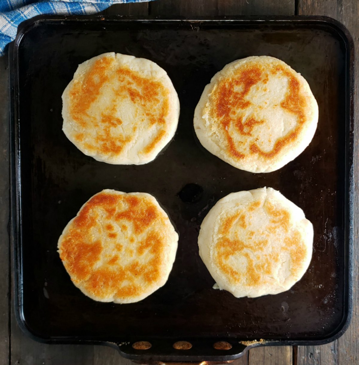 Then put a little oil in a large skillet or on a griddle and cook, turning once, until golden brown on both sides. Next, for the easiest way to make them, toss them in an oven at 360 degrees F. for about 15 minutes, right on the rack. That makes them cook all the way through (they should sound hollow when tapped) and a little puffier than if they’re just tended on the griddle until finished. Use the rack, though. If they’re baked in the oven on the same skillet or on the griddle you cooked them on, the bottom of the Arepa can get soggy. No one wants soggy bottoms, lol!