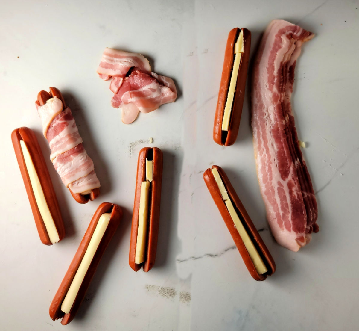 Slit hot dogs lengthwise down the middle leaving one side attached. Add cheese to the slit. Wrap with a slice of bacon and secure with toothpicks.