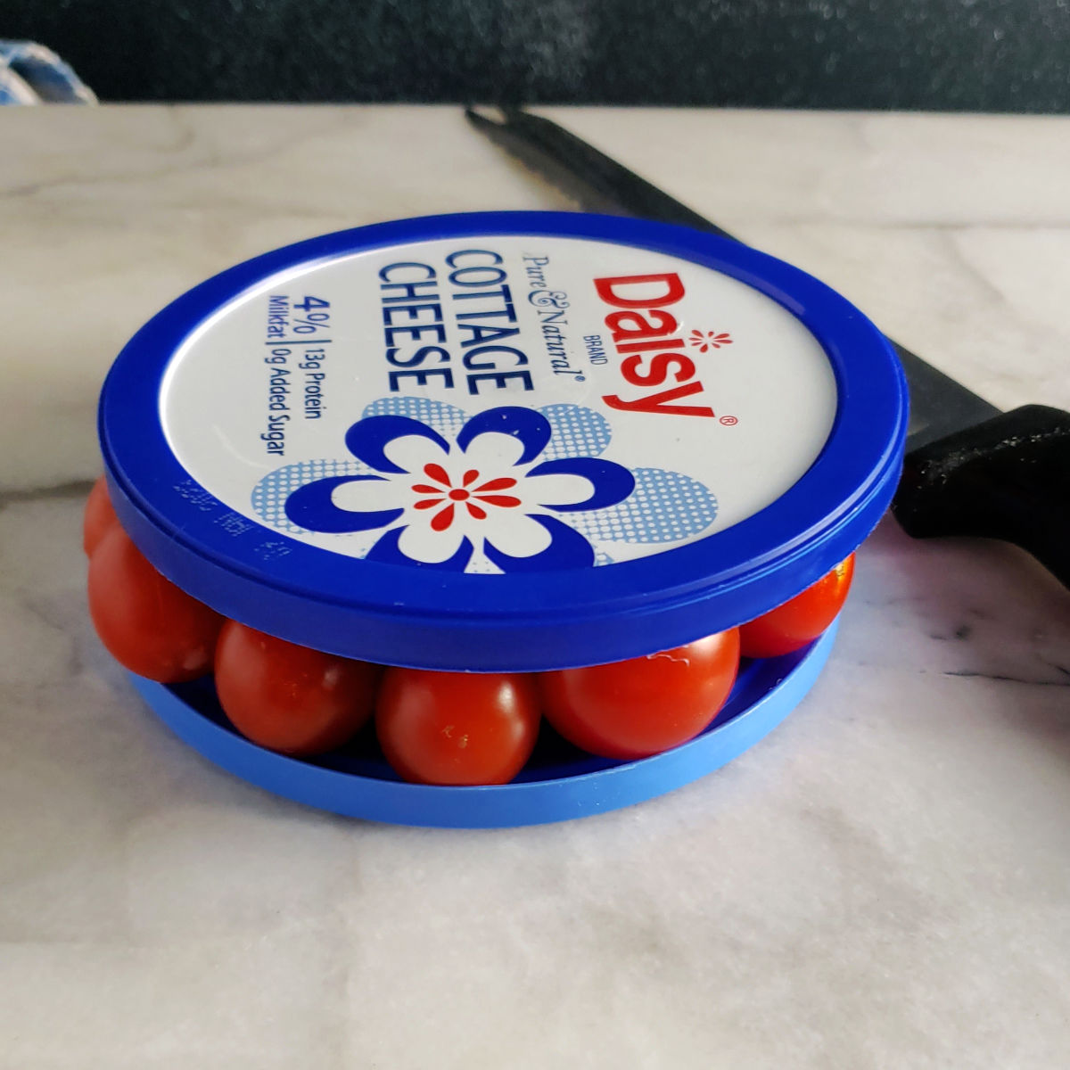 Tomatoes: If anything can be a pain, it’s cutting a lot of small roundish items, whether it’s tomatoes or olives, or baby potatoes. I always dump them into a lid, usually a yogurt, cottage cheese, or sour cream lid, placed upside down on the counter; add another lid on top and use a long, sharp knife to cut horizontally through the center as you hold the top lid down with your other hand.