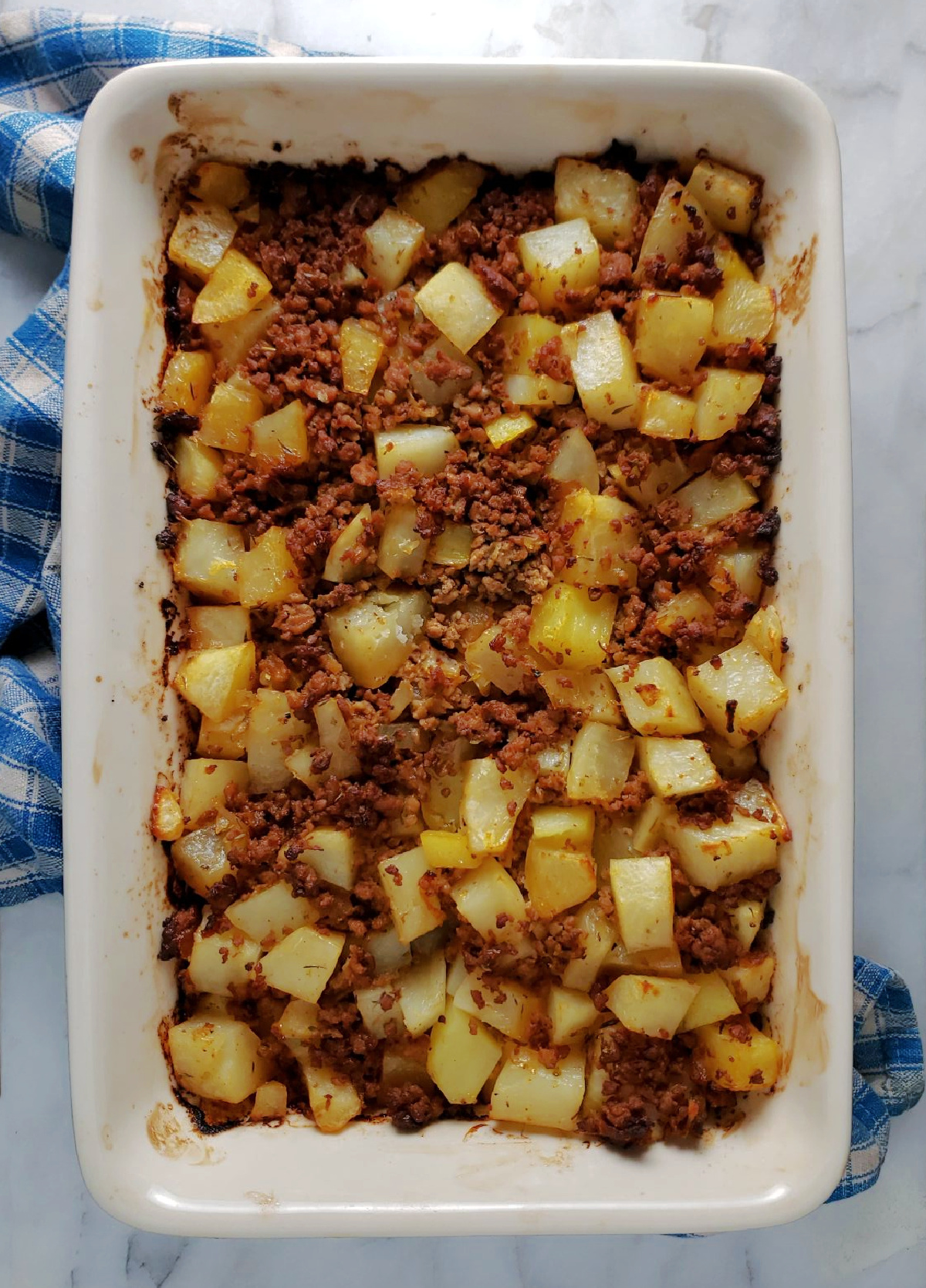 I keep wondering how cubed, frozen hash browns would work; I might try thawing them overnight, then baking them about 20 minutes to dry them before combining with the ground beef mixture.