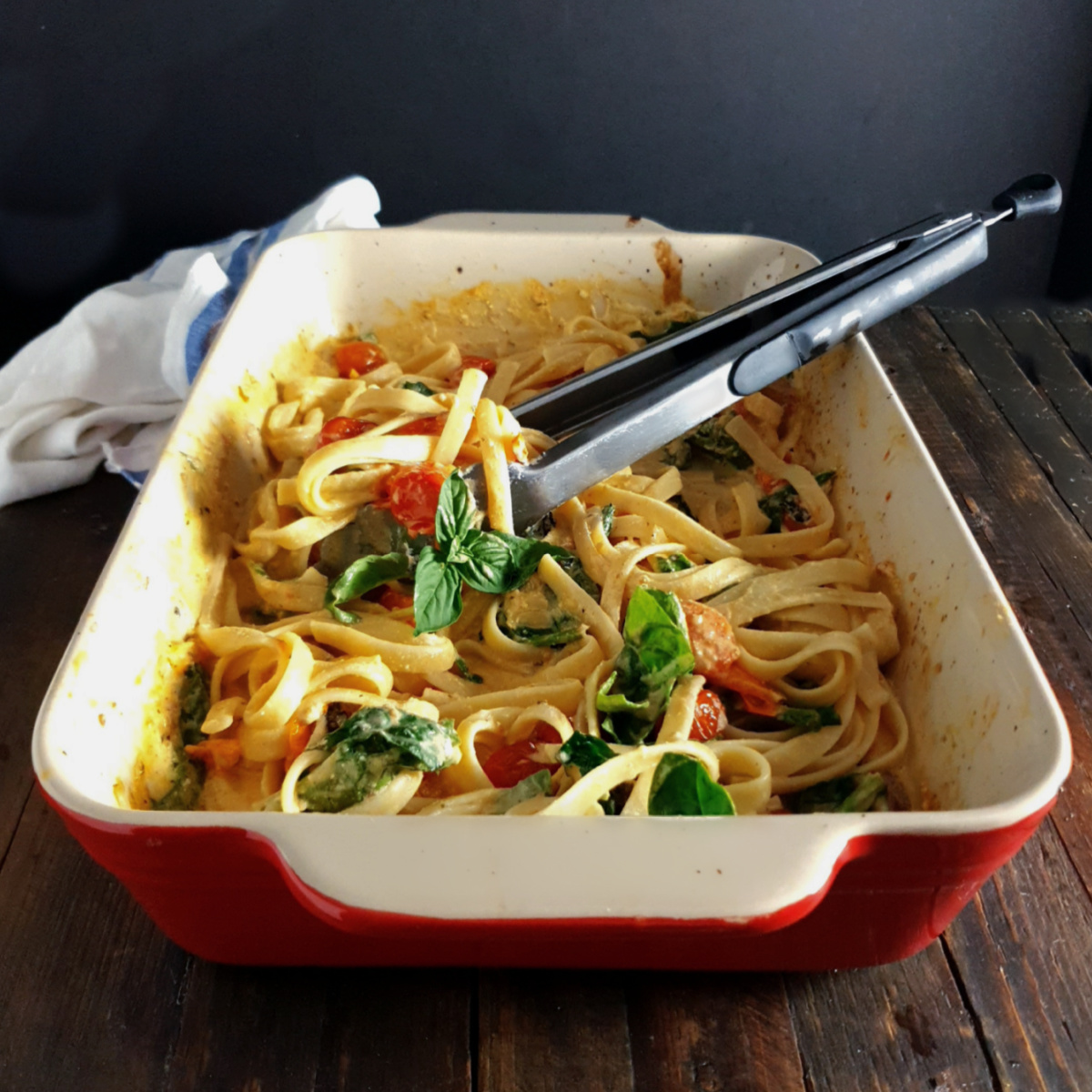 When the casserole comes out, squeeze the garlic out of the cloves, and mix everything up. Add a layer of fresh spinach and the cooked pasta right on top. Toss everything together. Make sure to save some of the pasta water in case it needs to be added once the dish is mixed. Garnish with Parmesan and more basil.
